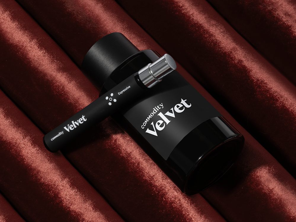 "Voor Commodity Velvet werd ik geïnspireerd door het beeld van levendige roze Turkse rozenblaadjes die zachtjes zweven over een mysterieuze, donkere achtergrond van rijkelijk warme vanille en zwarte Amber met een heerlijk vleugje geroosterde amandel in de lucht. Voor Velvet Personal gebruikte ik de delicatesse van roze Turkse rozenblaadjes vermengd met de frisheid van kokoswater en rijke vanille. Ik eindigde met warm wit hout terwijl ik de zwarte Amber verwijderde om een zachtere algehele geurbeleving te creëren."-Jerome Epinette